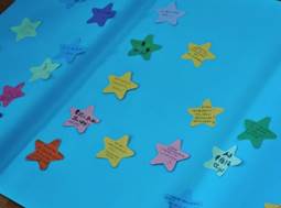 活动尾声,“星语星愿,汇聚能量——星光收集”匿名支持系统构建环节在舒缓音乐中展开。纪检2401班心理委员赵韵菡向同学们分发星星贴纸,引导大家静心回顾近期带来正面情绪与力量的瞬间,并将这些“能量来源”以关键词、短语或图画形式记录于贴纸上。随后,同学们依次将承载温暖记忆的星星贴至蓝色卡纸,共同构筑出一片“公共支持星系”。这一过程使每位参与者直观感受到集体中流动的积极情绪与支持力量,在发现共性的同时,迅速建立起“我们在一起”的归属感与心理联结,营造出紧密而安全的团体氛围。